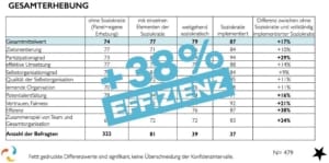 Wie die Ergebnisse des Wirkungsmessinstruments zeigen, liegt der Mehrwert einer umfassenden Soziokratie-Einführung bei der wesentlich höheren Effizienz der Teamarbeit (+38 von hundert Punkten) im Vergleich zur berufstätigen Durchschnittsbevölkerung.