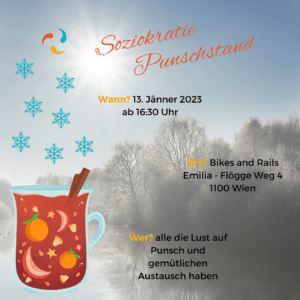 Wir möchten Euch herzlich zu unserem Punschstand am Freitag 13. Jänner 2023 einladen – Winterluft schnuppern, Punsch trinken, über Soziokratie, die Winterferien oder die vergangene Arbeitswoche plaudern und einen gemütlichen Nachmittag/Abend im Freien verbringen. Wir freuen uns darauf gemeinsam unsere Hände mit frischem Punsch und unsere Herzen mit schönem Austausch zu wärmen.