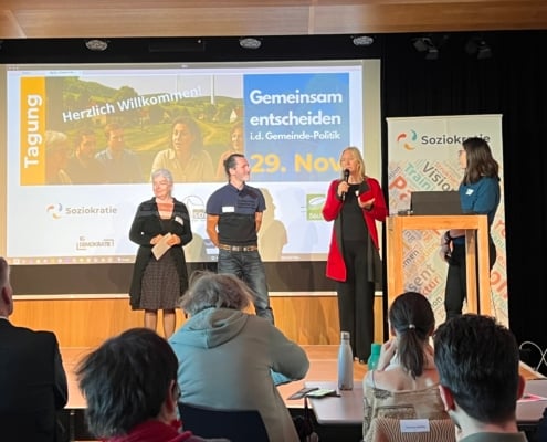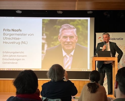 Bei der Tagung stellten wir die Frage, warum das Konsent-Prinzip in Gremien mit zufällig gelosten Bürger:innen so gut funktioniert? Wir wollen wissen, was uns noch daran hindert, auch in demokratisch gewählten politischen Gremien mit Konsent zu entscheiden? Und wir hörten von einem niederländischen Beispiel, wo es seit 10 Jahren gelingt, im Gemeinderat alle wichtigen Entscheidungen im soziokratischen Konsent zu treffen. Was lernen wir daraus für unsere Demokratie?